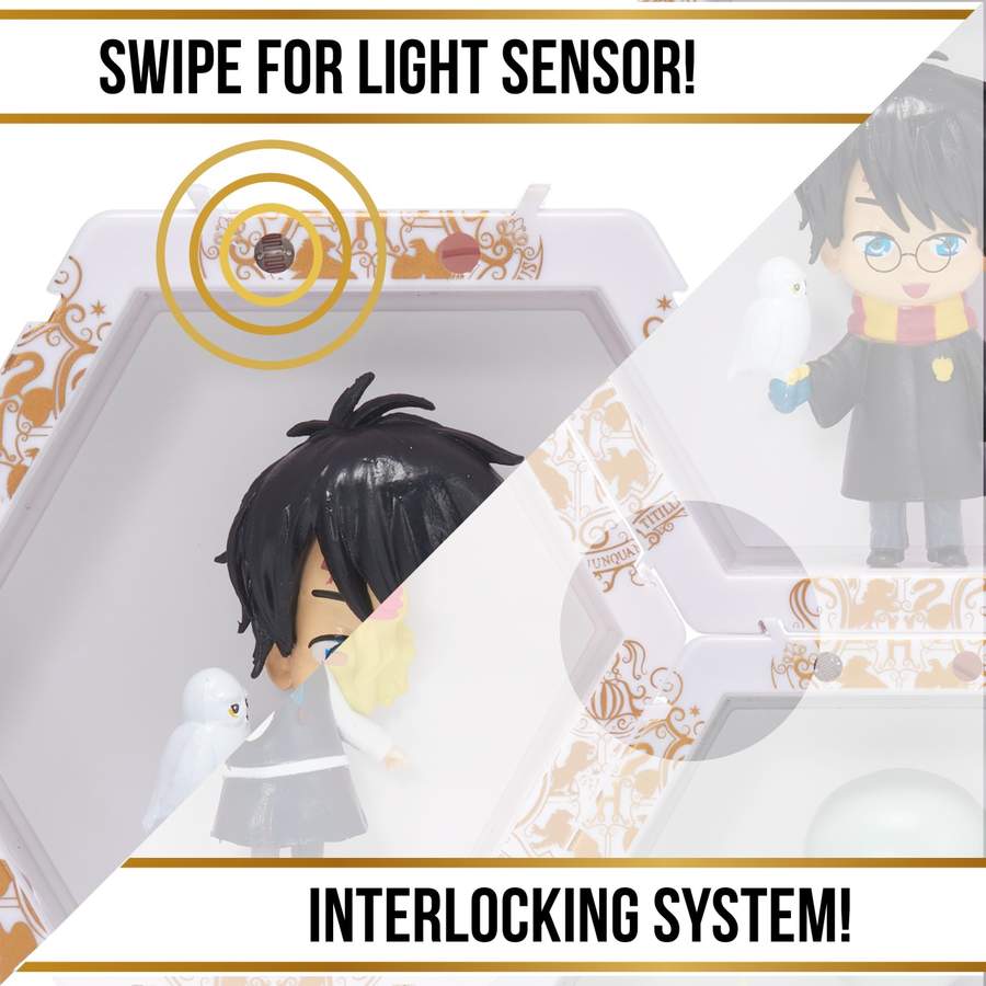 Fiecare personaj este situat in propriul POD in forma de hexagon cu lumini UV si senzor IR incorporat. Pur si simplu miscati mana peste senzor pentru a lumina WOW-ul! POD-ul! Misca-ti mana in fata POD-ului pentru a-l lumina si a dezvalui pictograme ascunse in spatele WOW!Pod-ului! Lumina se stinge automat dupa 30 de secunde. Conectati-le in cateva secunde! Colectia ta poate lua diferite forme si avea in fiecare zi, alt look! Limita e doar de imaginatia ta! Puteti chiar sa va scrieti numele sau initialele pentru a crea un afisaj care este fara indoiala si unic al dvs.! Colectionati si conectati personajele favorite printr-o colectie mai vasta de eroi WOW! PODS! Sunt disponibile personaje Marvel, DC, Disney, Disney Frozen, Sonic, Jurassic World, Harry Potter, Minionii si altele. Acest pachet contine personajul Harry si Hedwig.